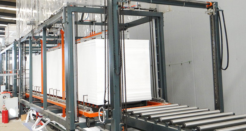 02EPS大顆粒在大模內模塑成1m×1.2m×6m或其它規格的大板塊,其過程分為充模、蒸汽加熱、冷卻、脫模等階段。模塑一塊大板的時間一般為10分鐘。